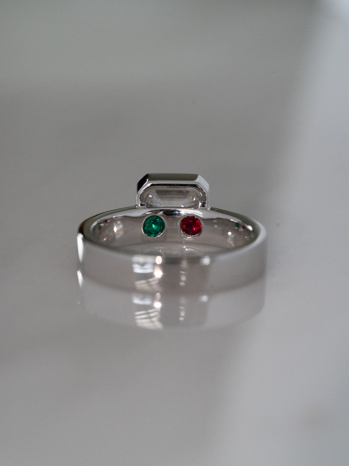 This one-of-a-kind custom engagement ring was designed to perfectly match her unique style, featuring a stunning emerald cut diamond in a contemporary bezel setting. Crafted in platinum with clean architectural lines and a low-profile design, this bespoke engagement ring includes hidden birthstones beneath the band for a deeply personal touch.
